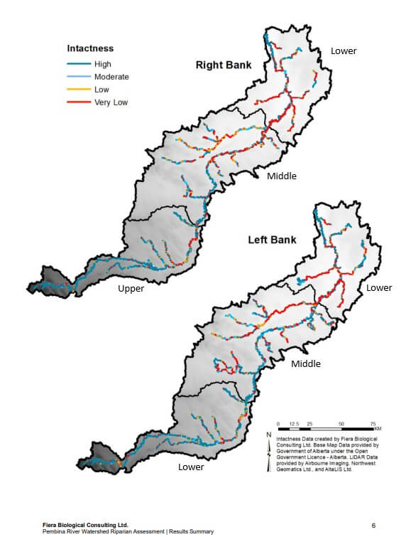 To get a better understanding of where those impacts highlighted in the SOW reports were, AWC worked with Fiera Biological Consulting to complete some riparian assessments for the Pembina River watershed. These reports used satellite imaging to assess the riparian health of the Pembina itself, as well as the riparian health of the many tributaries and lakes throughout the sub-basin. This report looked at things like the intactness of shoreline vegetation as well as natural and anthropogenic pressure to help determine which areas of the watershed would be considered a high priority for restoration and conservation projects.