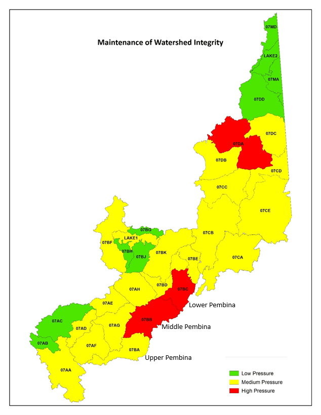 While compiling these SOW reports, land use and major industries in the areas were looked at, and it was realized that a lot of the impacts in that middle and lower Pembina region were associated with municipal developments and agricultural land use. This is a result of things like linear disturbances for roads and oil and gas exploration, clearing of land for fields (especially clearing of riparian areas around different water bodies), and the straightening of rivers and creeks that was done years ago by local governments (especially prevalent in the lower Pembina area), just to name a few examples of the land-use pressures in this region.
